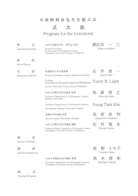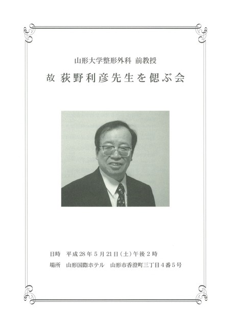 5月21日(土) 同門会員で山形大学教授であった「故 荻野利彦先生を偲ぶ会」が山形国際ホテルにて開催されました。北大同門の石井清一先生(札医大名誉教授)、加藤博之先生(信州大教授)、高原政利先生(泉整形外科病院院長)をはじめ6名が弔辞を述べ、荻野先生の思い出や業績について語りました。2人の外国人も弔辞を述べ、荻野先生がいかに国際的であったかを偲ばせました。